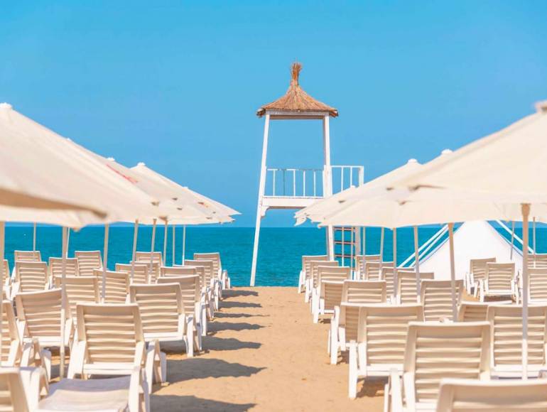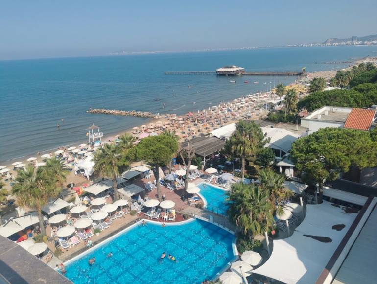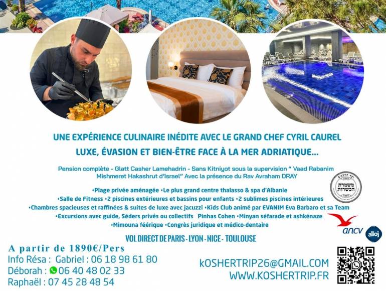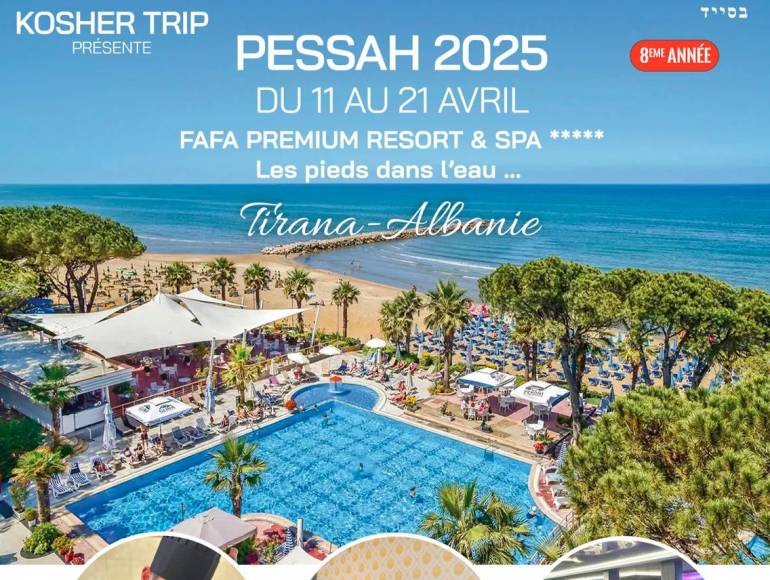 For Passover 2025, KOSHER TRIP brings your dream trip to life and takes you to an original and increasingly sought-after destination that combines luxury and breathtaking landscapes—ALBANIA, known as the Pearl of the Balkans! Enjoy an authentic experience at the prestigious FAFA PREMIUM RESORT & SPA HOTEL ***** right on the beach, facing one of the most beautiful fine sand beaches in the region. Make your holiday an unforgettable memory with a unique location and high-end services. Fully privatized and secure. Ideally located just 35 minutes from Tirana airport and a few steps from the city center of Golem, a picturesque seaside enclave along the stunning Adriatic Sea, it is a perfect starting point to explore the wonders of this country and the beauty of its coastline. An oasis of peace and comfort. In addition to its magnificent location and numerous amenities, the Fafa Premium Hotel & Spa***** offers a wide range of luxurious facilities and services to make your stay even more enjoyable. Whether you seek relaxation or a change of scenery, this hotel provides everything you need for an unforgettable Passover vacation. Book now and be enchanted by the luxury and hospitality of this resort on the breathtaking Albanian coast. Enjoy the soft Balkan sun by the two stunning outdoor pools designed for adults, featuring vast terraces and sunbathing areas equipped with loungers and umbrellas. Children can enjoy a paddling pool and a safe water play area. Start your day at the pool bar with a fresh coffee overlooking the water. In a refined atmosphere, take in the stunning view of the Adriatic Sea. T he Beach Bar is located right next to the hotel’s beautiful beach—an ideal spot to unwind or end the day watching a mesmerizing sunset in an unparalleled relaxing atmosphere. On the wellness side, the luxurious Thalasso & Spa center, known as the largest spa center in Albania, has been designed as a true sanctuary of serenity within the hotel: saunas, hammams, jacuzzi with a starry ceiling, a splendid heated indoor pool, treatment rooms with exclusive massage services, beauty area, and a fitness space, all inviting you to unwind. The hotel's private and well-equipped beach is the perfect place for a relaxing day by the sea. Sun loungers and umbrellas are available for guests to enjoy the idyllic setting while children have fun at the kids’ club. A beautiful pedestrian promenade lined with royal palm trees runs along the vast beach, promising delightful walks by the lively marina. |