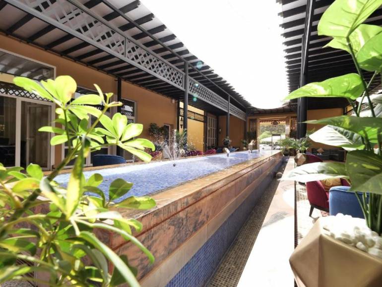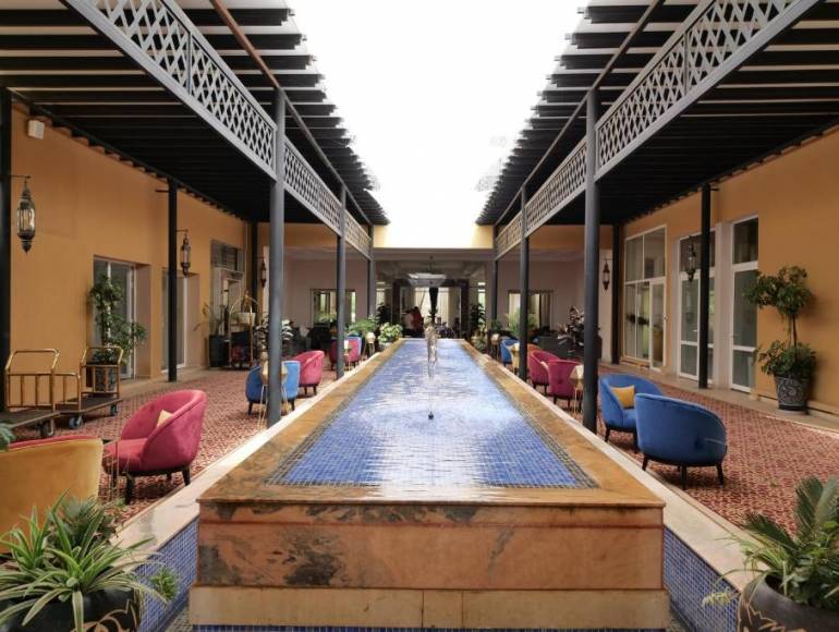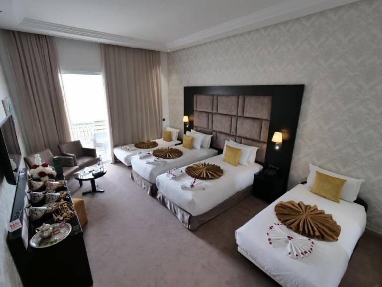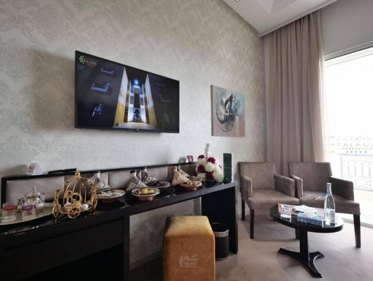 Just 15 minutes from Marrakech-Menara Airport and the historic city center, the palace offers the perfect balance of serenity, comfort, and accessibility. It stands out for its vast outdoor spaces, a huge lush garden, a large central pool, several ponds, and a water park dedicated to families.