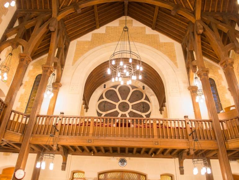 La synagogue est concue selon un plan carré inspiré des édifices de la Grèce médiévale. Les matériaux sont simples : brique, pierre blanche, et surtout bois, permettant un jeu de charpente extraordinaire.