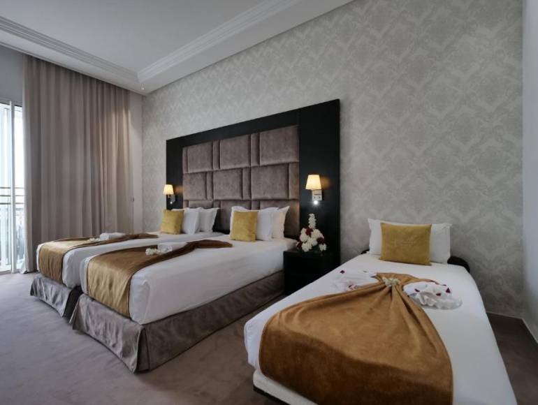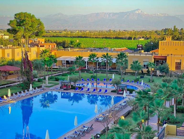 À seulement 15 minutes de l’aéroport Marrakech–Menara et du centre-ville historique, le palace offre un équilibre parfait entre sérénité, confort et accessibilité. Il se distingue par ses vastes espaces extérieurs, un immense jardin luxuriant, une grande piscine centrale, plusieurs bassins et un Aquaparc dédié aux familles.