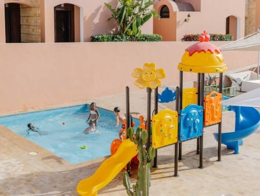 Pour les enfants, une piscine dédiée avec jeux aquatiques garantit des journées joyeuses et animées.
